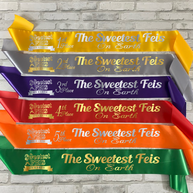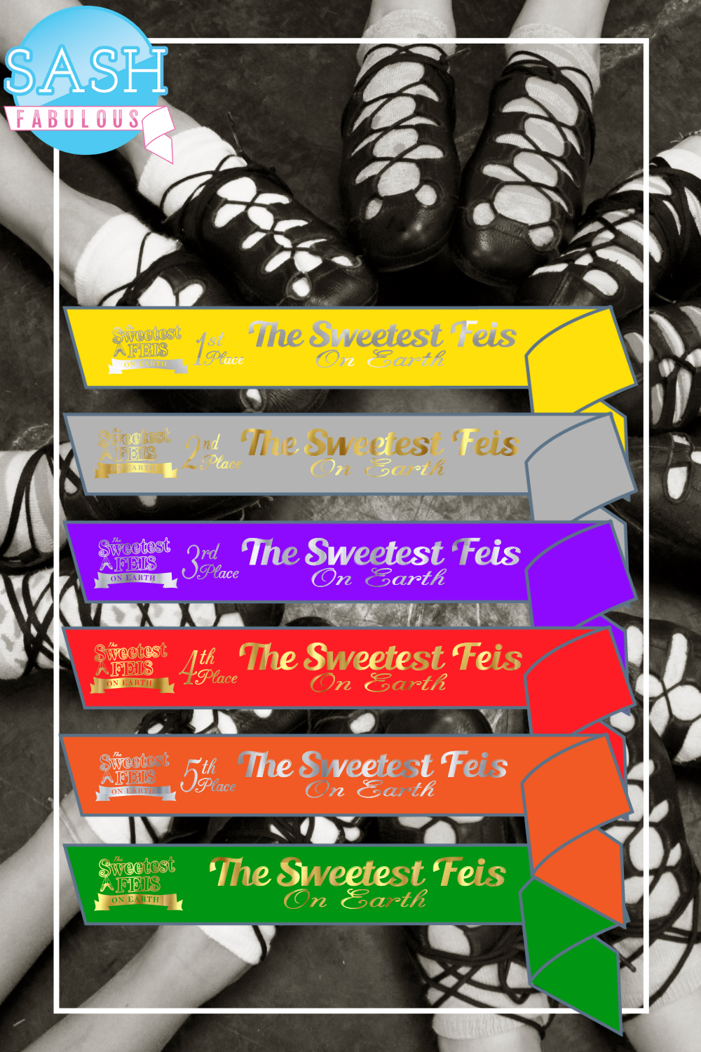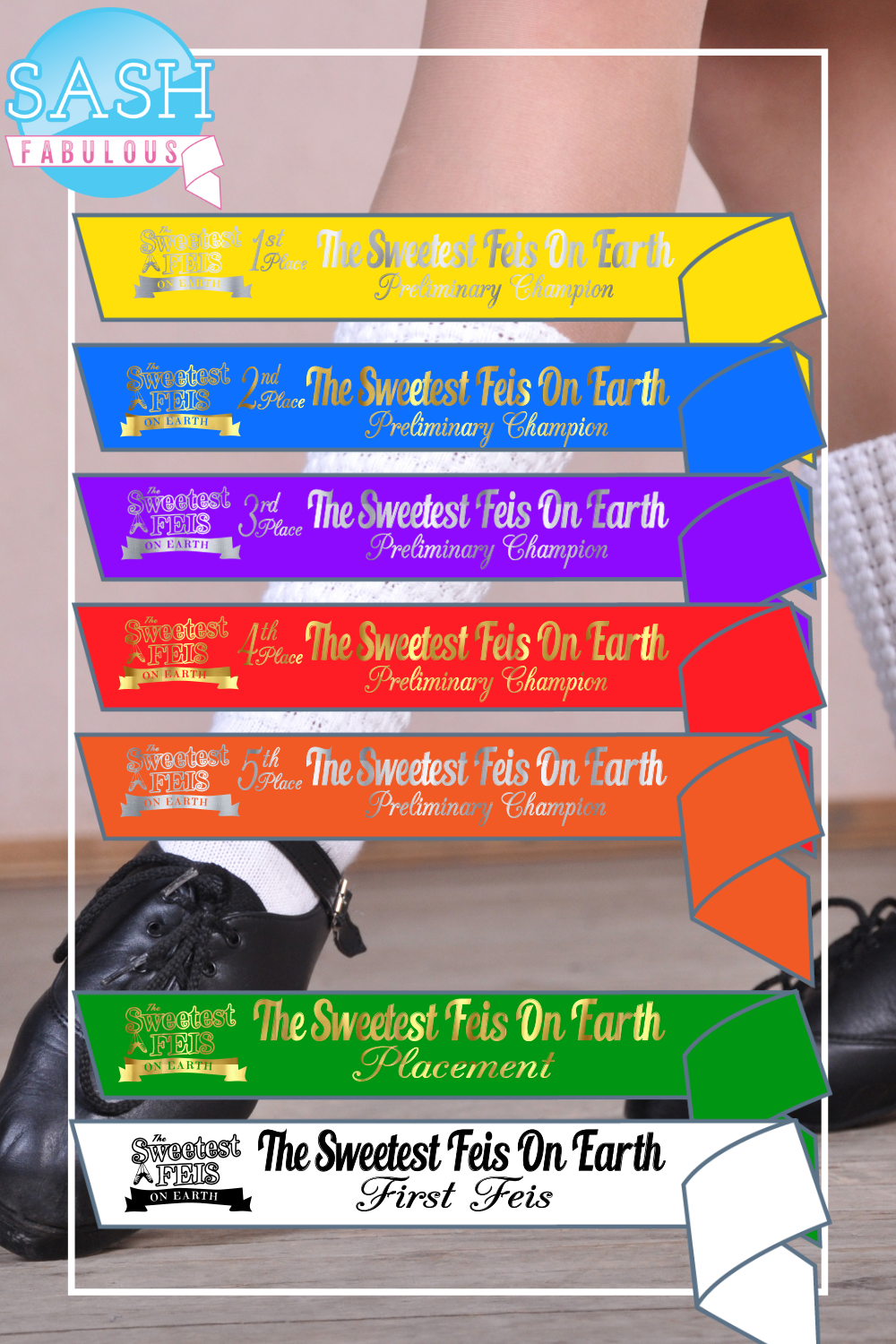 Our Feis sashes are made with premium satin ribbon and measure 3 or 4 inches wide by 70 inches long. Sashes are pinned at the hip or we will seal the sashes for you. If you choose to pin the sashes, we send complimentary pins for you. Please see price sheet for current sealed end options!