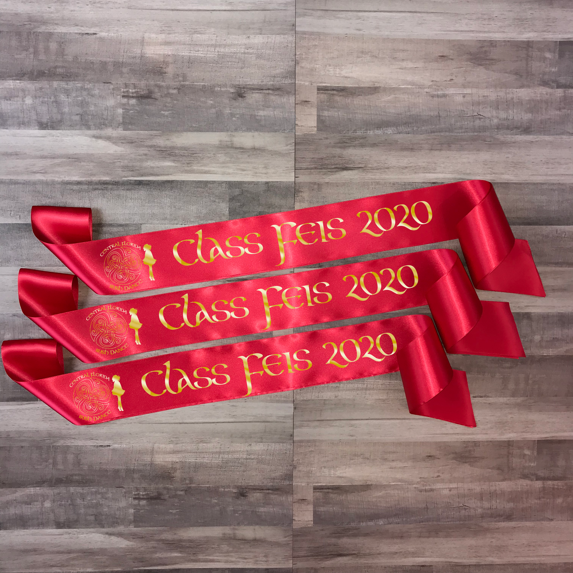 Our Feis sashes are made with premium satin ribbon and measure 3 or 4 inches wide by 70 inches long. Sashes are pinned at the hip or we will seal the sashes for you. If you choose to pin the sashes, we send complimentary pins for you. Please see price sheet for current sealed end options!