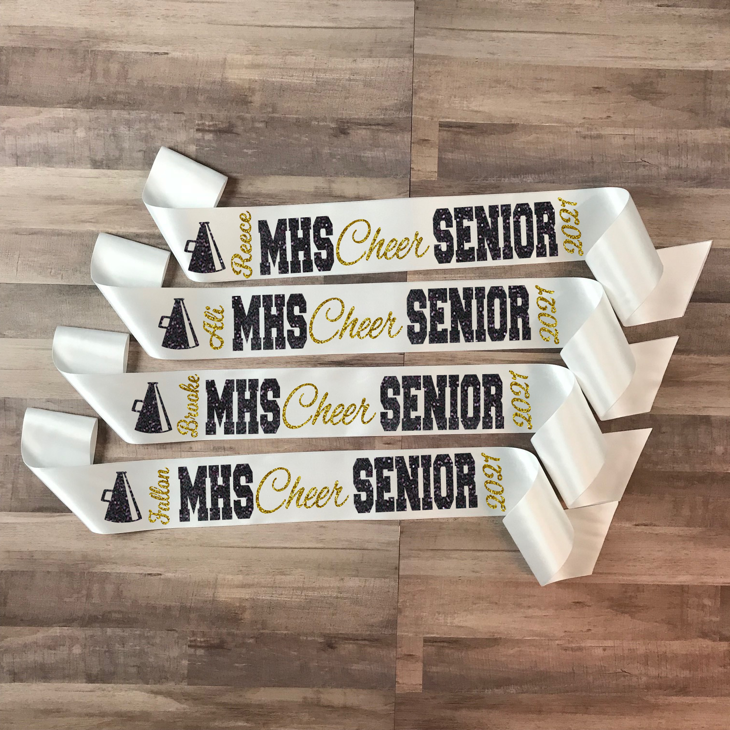 All Senior Sashes are custom made to order, therefore we do not accept returns on Senior Sashes. Please make sure all athlete names are spelled correctly as we are not responsible for incorrect spelling.