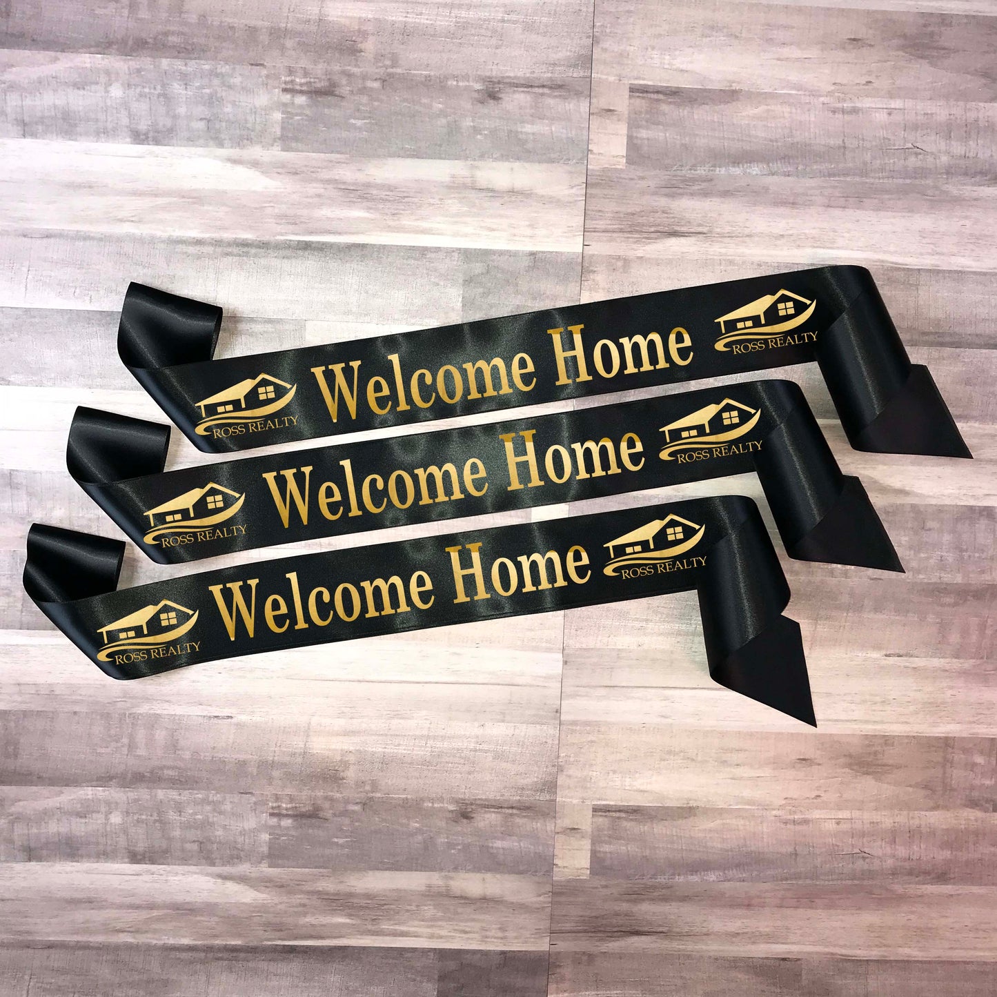 Our WELCOME HOME ribbons are made with premium single sided satin ribbon and measure 4 inches wide by 35 inches long to fit precisely on the door of your new homeowners. We create your WELCOME HOME ribbons made to order with your text, font selection and logo. Shipping is always free as well as art design, set up and unlimited revisions.